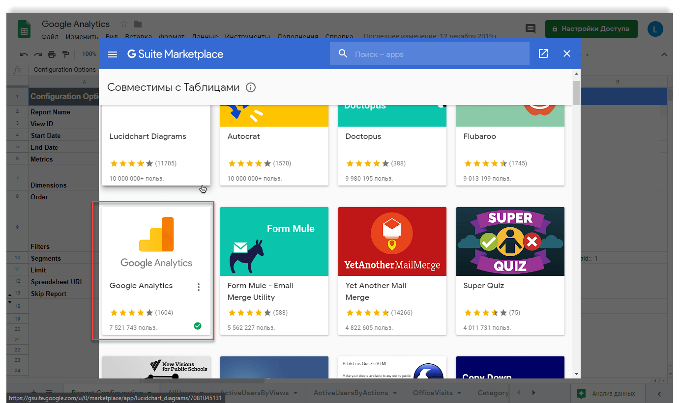 For me, the most comfortable workspace for working with statistics data is a table editor such as Google Sheets or Excel. In the web UI, you can build a basic report, export it to Excel, and calculate all needed values in the table editor after that. But it takes a lot of time. So, I started to learn how to export data directly to tables. And I found a solution! Google Analytics provides an add-on for Google Sheets that lets you upload data directly to tables. Do the following steps first: