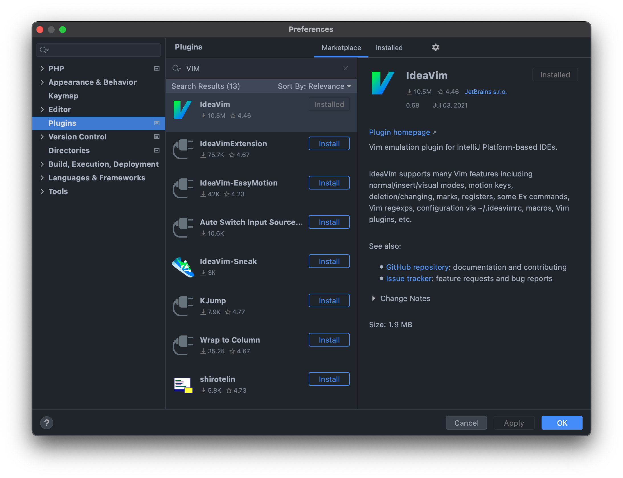 Thats all. IDE will ask you to restart itself, and after loading plugin will be activated and can be used in editor Also, if you want to apply some modifications for VIM-mode (such as remapping, macros and so on), you can do it in file which located in ~/.ideavimrc. For example, I prefer to remap button for changing mode (Esc in default behavior) for combination jj. My config will be seemed like so: