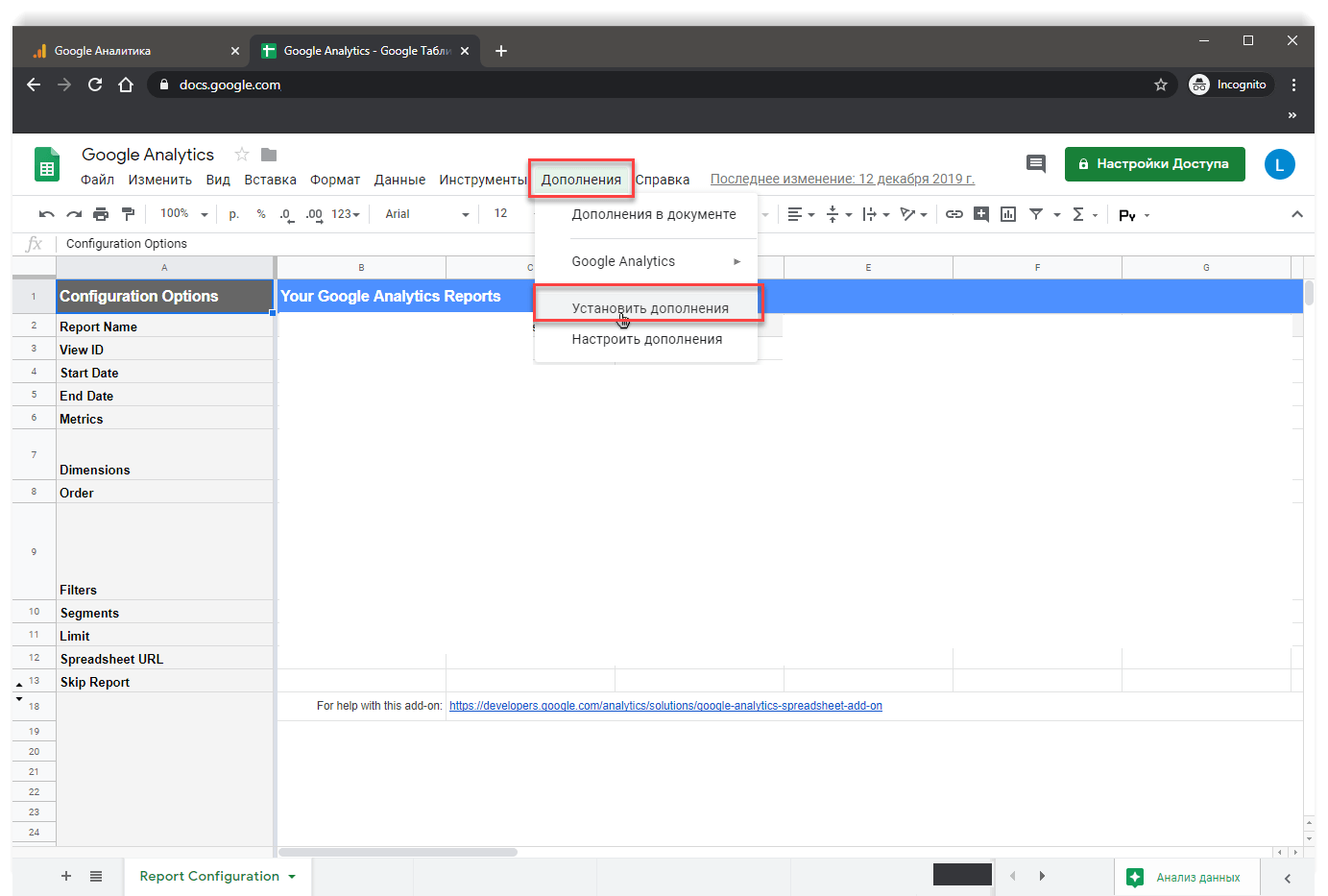 For me, the most comfortable workspace for working with statistics data is a table editor such as Google Sheets or Excel. In the web UI, you can build a basic report, export it to Excel, and calculate all needed values in the table editor after that. But it takes a lot of time. So, I started to learn how to export data directly to tables. And I found a solution! Google Analytics provides an add-on for Google Sheets that lets you upload data directly to tables. Do the following steps first: