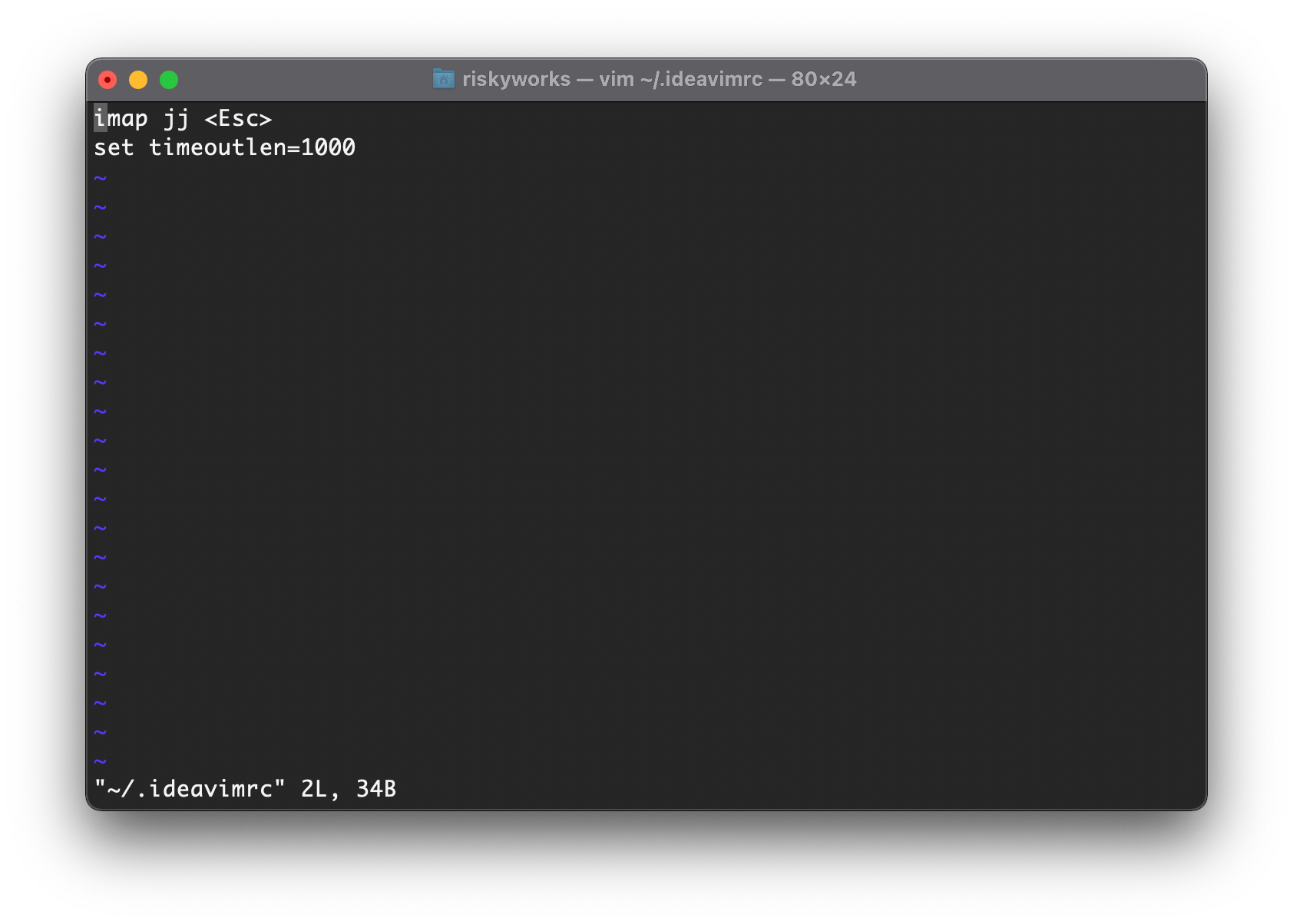 Thats all. IDE will ask you to restart itself, and after loading plugin will be activated and can be used in editor Also, if you want to apply some modifications for VIM-mode (such as remapping, macros and so on), you can do it in file which located in ~/.ideavimrc. For example, I prefer to remap button for changing mode (Esc in default behavior) for combination jj. My config will be seemed like so: